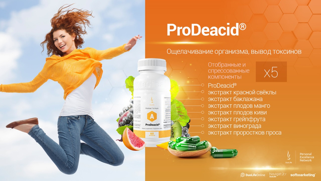 ProDeacid® (Запатентована формула антиоксидантів, отриманих із суміші сухого екстракту фруктів і овочів у змінних пропорціях) допомагає ефективно очищати організм від токсинів, що накопичилися в ньому, і важких металів, водночас регулюючи рівень pH нашого організму.